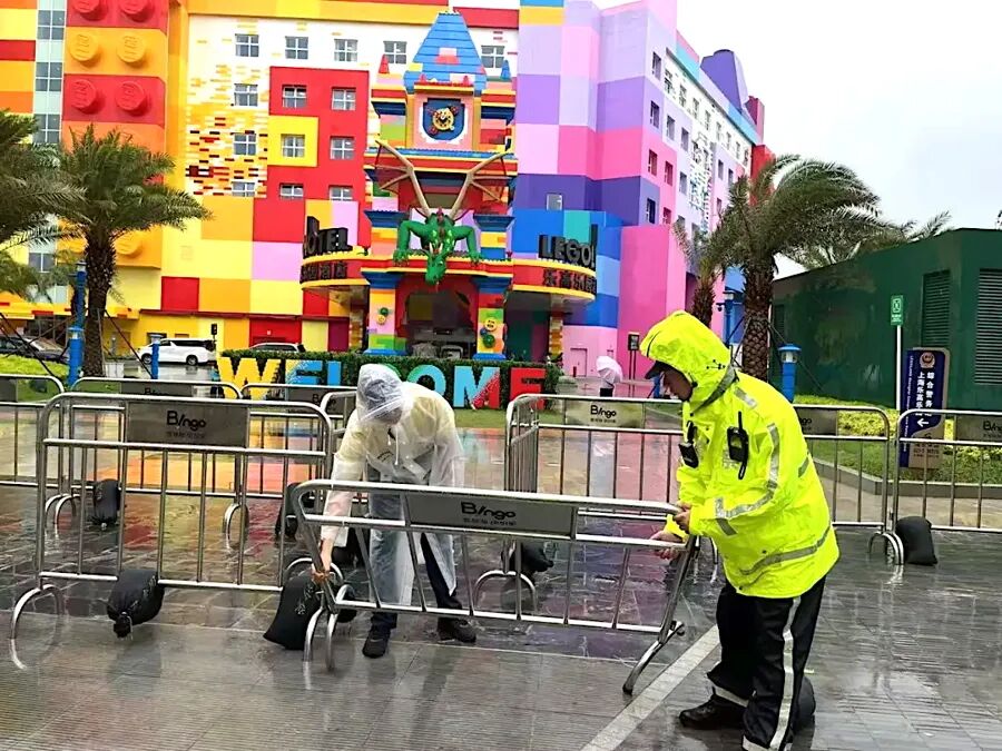 7月30日,金山区兴塔派出所民警在乐高乐园度假区开展防汛工作。