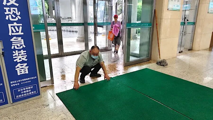 7月30日,普陀区中心医院对门急诊区域增设防滑垫、雨伞套和安全警示标识,并为就诊患者提供免费中药茶饮。
