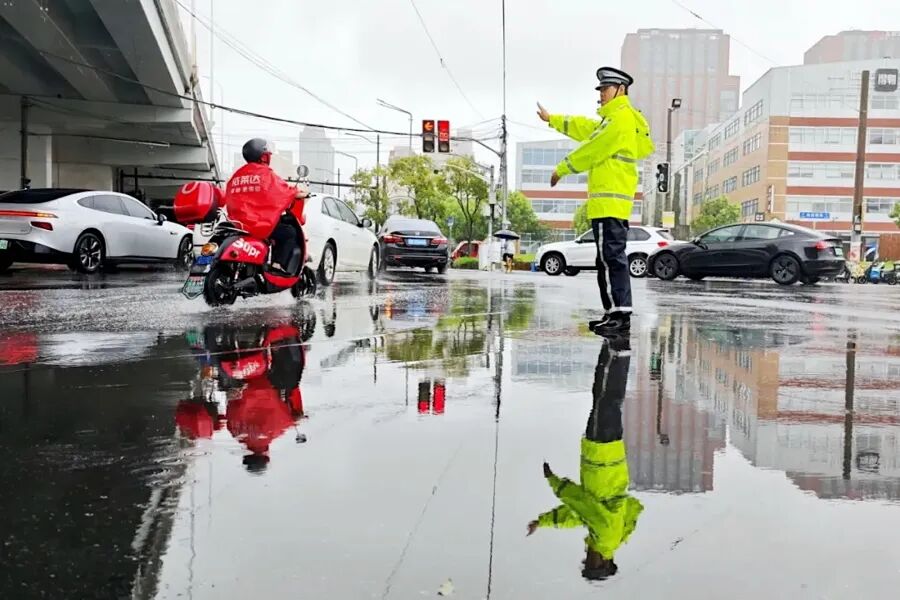 “同志,不要再拍照了,赶紧回家吧,这里危险!”普陀警方以苏州河沿线为重点,施行“视频+实兵”巡逻值守,避免发生人员落水等意外情况。针对道路交通,普陀分局交管支队全员上岗,在主要道路、桥梁及低洼易涝区域增设了警示标识和临时交通管制点,采用24小时巡逻值守制度,动态关注降雨情况,严防发生“淹车亡人”事故,以实际行动守护人民群众财产安全。