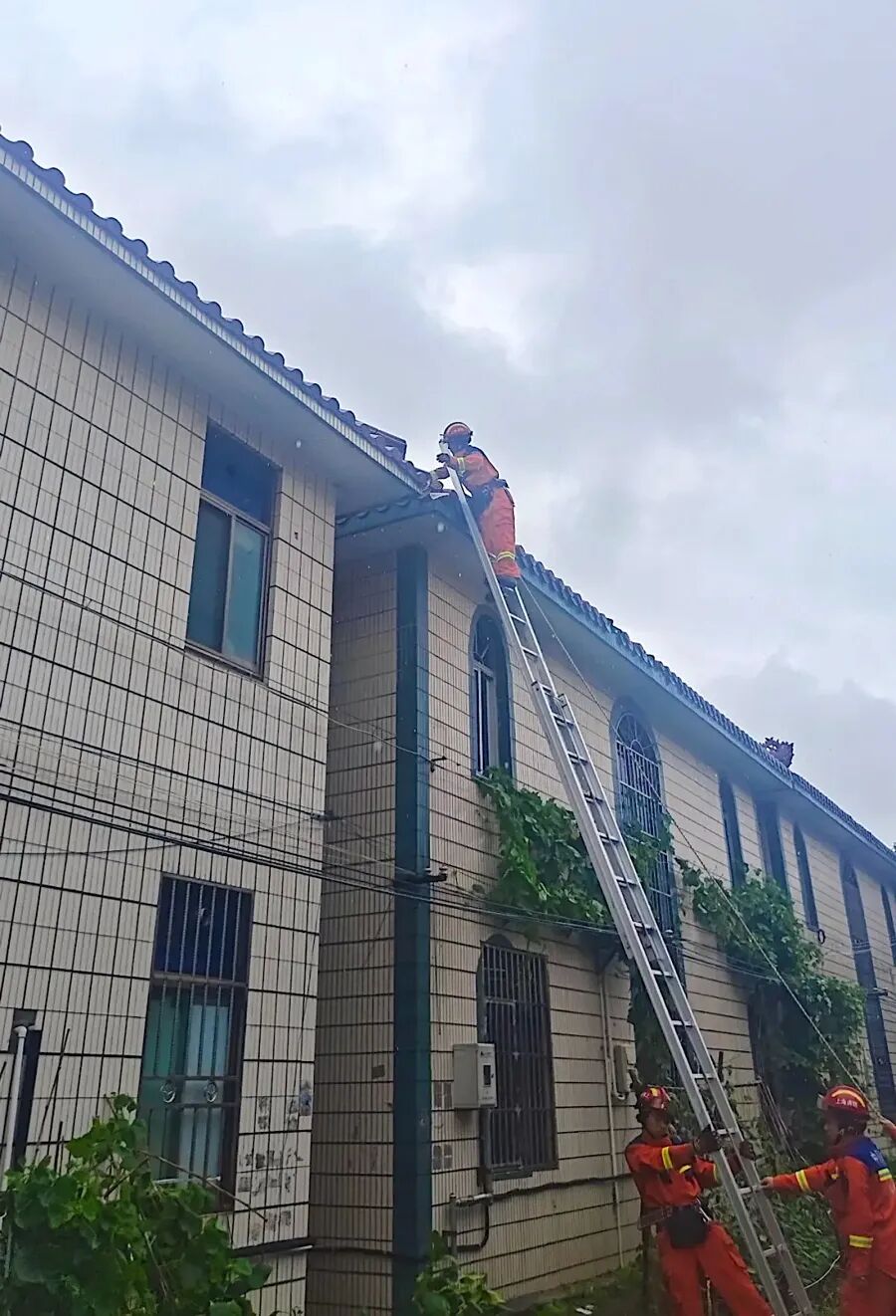 7月30日上午10时48分,松江区真玉路9弄2号一户居民建筑屋顶受风雨影响,瓦片成片松动,存在高空坠落风险。岳阳消防救援站接警后迅速出动前往处置,架起九米金属拉梯,攀爬到屋顶对松动构件进行拆除和加固作业,化解居民“头顶上”的安全隐患。