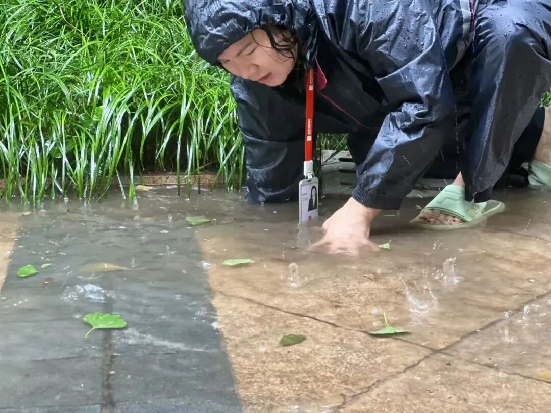 搞定了主干道积水,来不及休息,徐健又赶往小区其他易积水点位巡查。