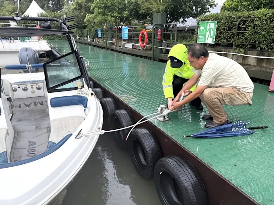 7月30日,青浦晨光游艇码头,工作人员争分夺秒,对每一艘游艇进行细致加固。