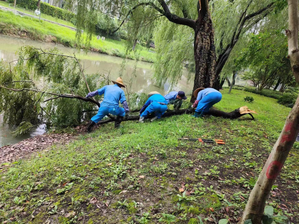 普陀区城投公司全员24小时待命,下属园开公司在全区公园、绿地加固空调外机、工地围挡等易坠物,防范高空坠落风险,对风口、路口、新种树木路段等重点区域树木进行再排查、再加固。